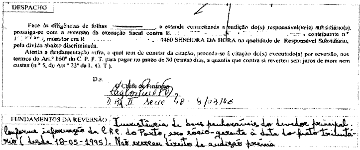 3. Pelo Chefe do Serviço de Finanças do Porto 3 foi proferido o despacho de 02/11/2006 (de fls. 49) a determinar a audição dos vários responsáveis subsidiários, entre eles o aqui Oponente para efeitos de reversão da execução, com o seguinte teor: